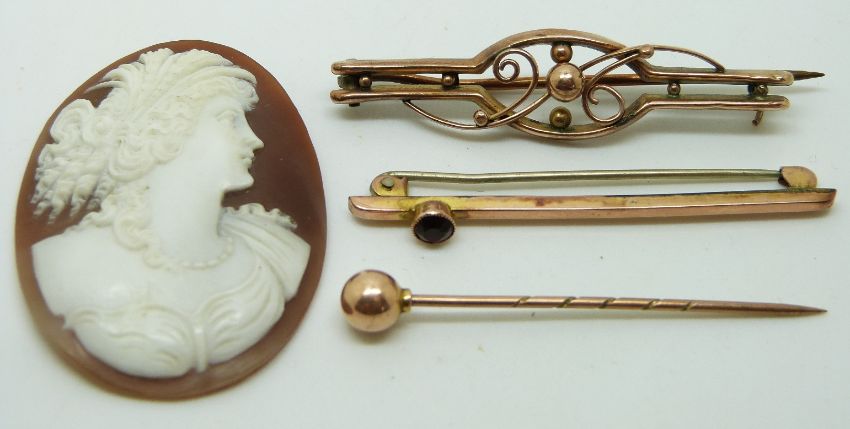 Two 9ct gold brooches, a Victorian stick pin and a cameo, 4g