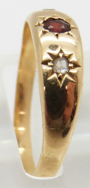 A 9ct gold ring set with a garnet and rose cut diamonds in a star setting, 2.8g, size N