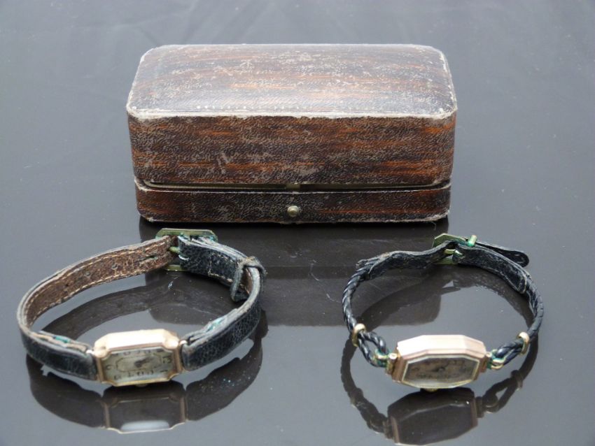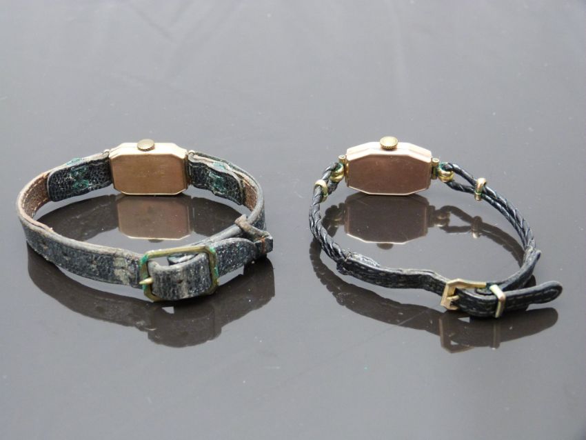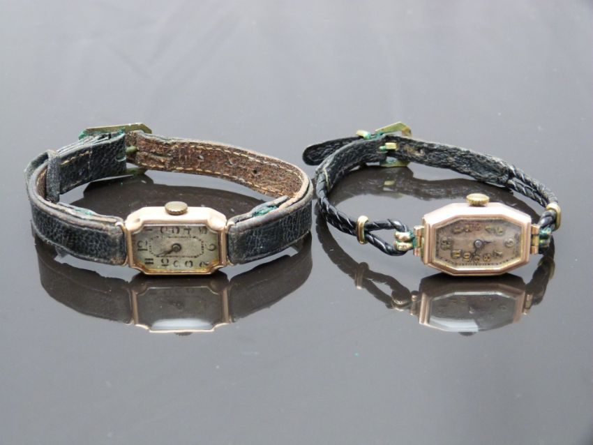 Two 9ct gold ladies wristwatches, both with Arabic numerals, silver dials and octagonal cases, on black leather straps.