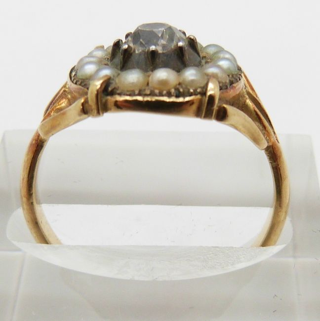 An early Victorian ring set with an old cut diamond of approximately 0.35ct surrounded by seed pearls, 4.3g, size N