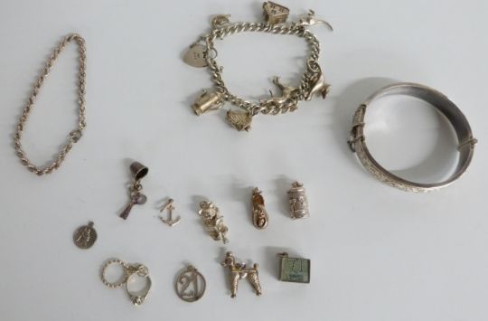 A hallmarked silver bangle in Perry Greaves Birmingham box, silver charms and bracelet including a poodle dog, agate pendant, silver necklaces etc
