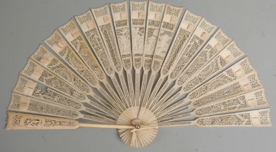 18th/ 19thC European ivory brise arrow fan with cut out sticks and ribs, the carved central section depicting a mythological scene of cherubs and a chariot with a foiled paste rivet, length 17cm