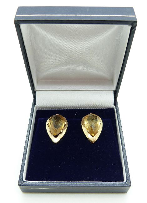 A pair of 9ct gold earrings set with a pear mixed cut citrine to each