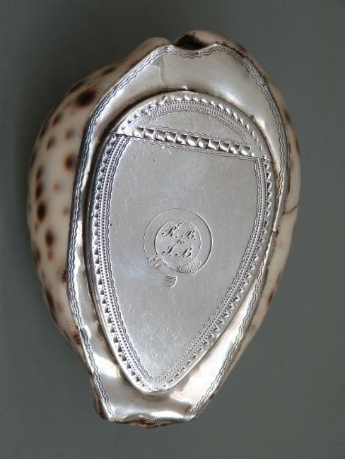 18th century Scottish provincial silver mounted cowrie shell snuff box with engraved decoration to the part hinged lid, with make's mark possibly JS for James Smith Aberdeen, length 95mm
