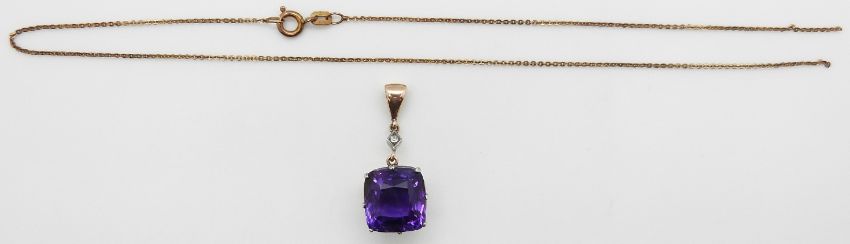 Victorian/ Edwardian pendant set with a cushion cut amethyst measuring approx 11.4ct and a diamond