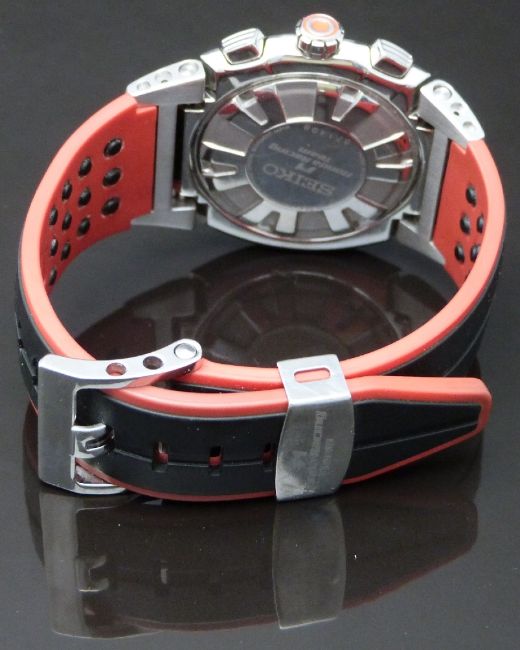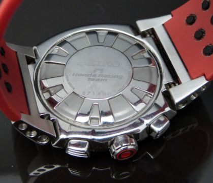 Seiko Sportura F1 Honda Racing Team gentleman's chronograph wristwatch ref. 7T62-0GR0 with alarm, date aperture, luminous hands, white baton markers, red centre seconds hand, black dial, stainless steel case and calibre 7T62 quartz movement, on orange and black rubber strap, case diameter 42mm, serial number 871498.