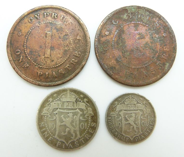 Cyprus Queen Victoria coinage comprising 1879 and 1889 1 piastres, together with a 1901 9 piastres, a 1901 9 piastres and a 4 1/2 piastres example, all about Fine (four coins in all)