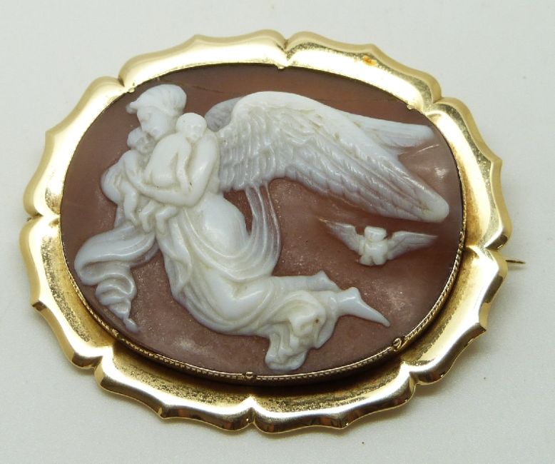 Victorian gold brooch set with an unusual scene of an angel and cherubs, 4.3 x 3.3cm