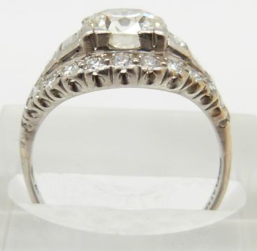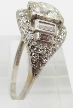 Art Deco ring set with a central diamond of approximately 1.5ct flanked by two baguette cut diamonds to either side and further round cut diamonds to the border, 4.5g, size O