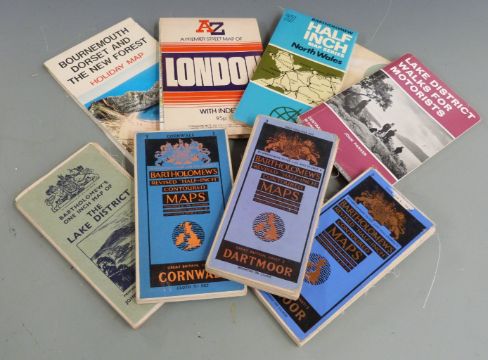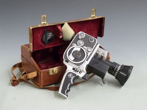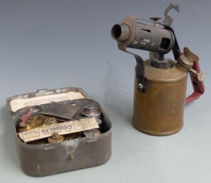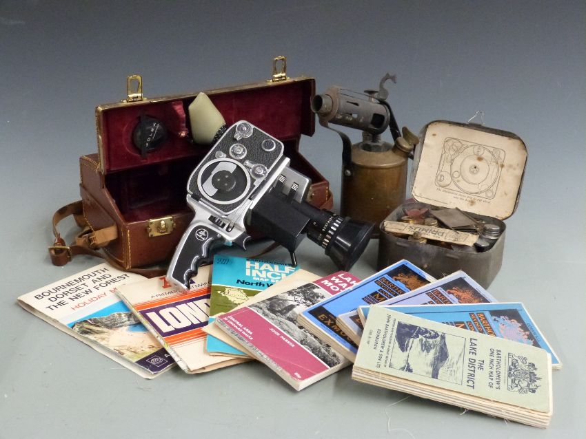 A collection of maps, blowtorch, Bolex cine camera etc