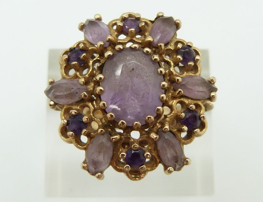A 9ct gold ring set with amethysts, 7g, Size N