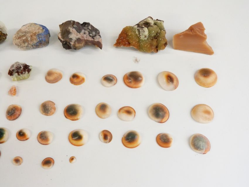 Fifty-seven various shiva shells and mineral samples including calcite.