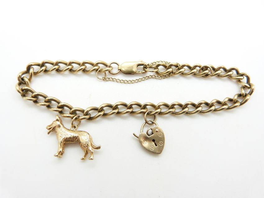 A 9ct gold curb link bracelet with a 9ct gold dog charm and heart padlock clasp, 19.4g