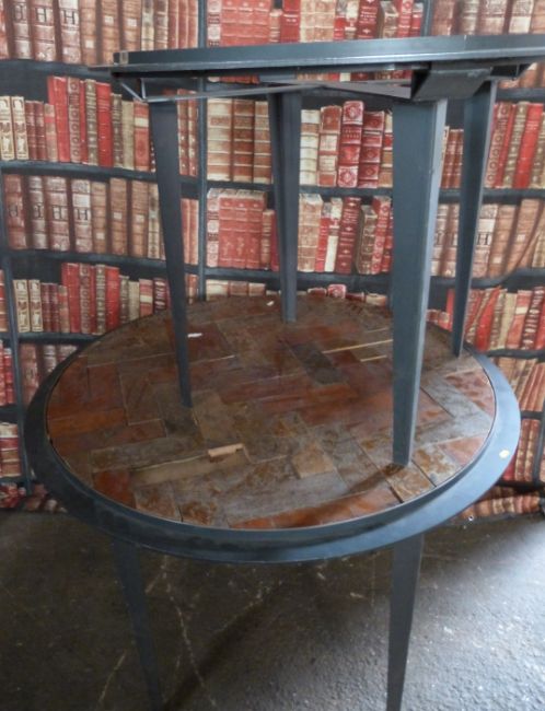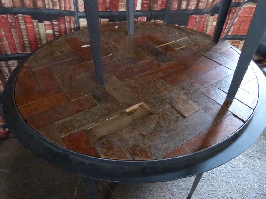 Industrial/haberdashery/shopfitting two circular steel tables, one inset with parquet tiles, largest 120cm diameter x H90cm