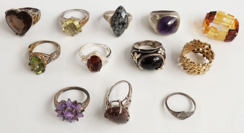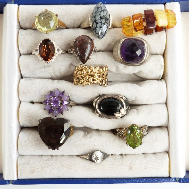 Eleven silver rings set with various gemstones, natural glass, quartz, etc
