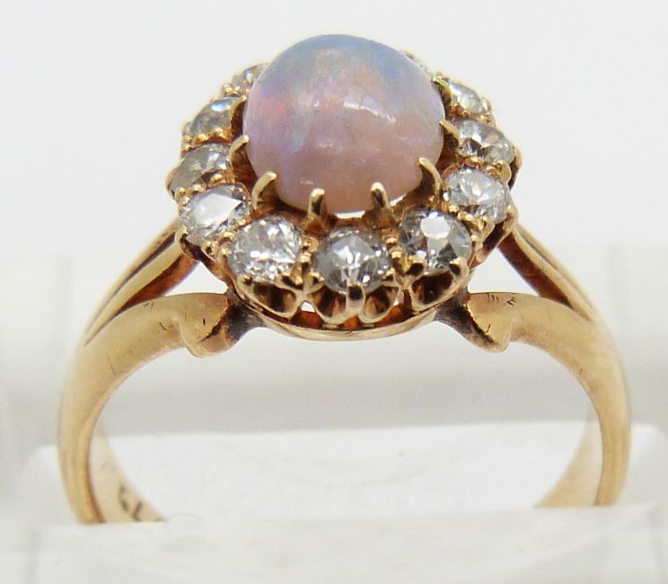 Edwardian 18ct gold ring set with an oval opal cabochon surrounded by diamonds, Birmingham 1901, 4.3g, size L