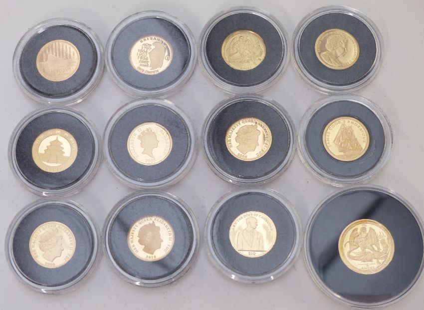 Please note description amendedTwelve 24ct gold miniature commemorative coins with certificates including Royal commemorative, Concorde etc, 11 weighing 1.2g, the twelfth an 'Angel' example weighing 1.55g