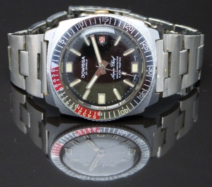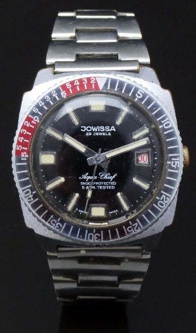 Jowissa Aqua Chief automatic gentleman's divers wristwatch with date aperture, luminous hands and hour markers, black dial, black and red bezel, stainless steel case and 21 jewel calibre 158 movement, on stainless steel bracelet, case diameter 32mm.