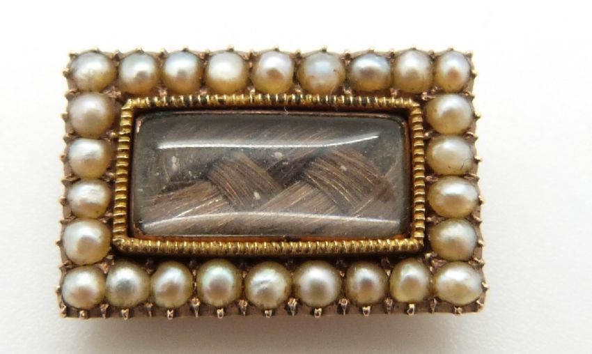 Victorian mourning brooch set with plaited hair to the central glass compartment surrounded by foiled garnets, 1.8 x 1.5cm, and a similar example set with seed pearls to the border, 1.8 x 1.1cm