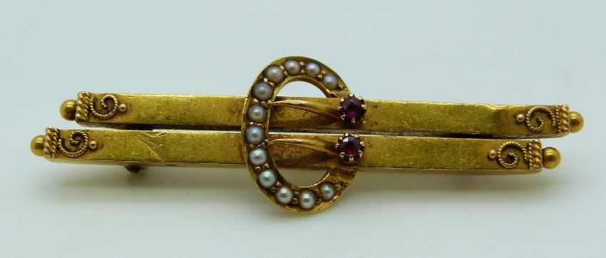 Edwardian hallmarked 15ct gold brooch set with rubies and seed pearls and two rubies in a buckle design, 2.8g