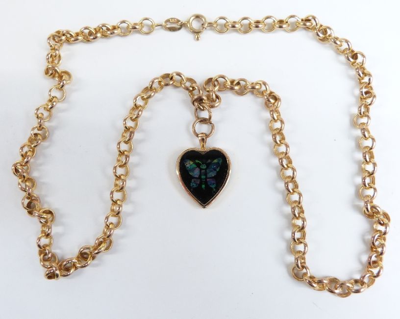 A 9ct gold necklace with heart shaped opal mosaic pendant decorated with a butterfly, 25cm drop, 6.2g
