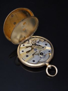George Edward Frodsham 18ct gold open faced pocket watch with blued hands, black Roman numerals, engraved self coloured dial, engraved case and dust cover signed 'G E Frodsham, 31 Gracechurch Street, London', case diameter 40mm, serial number 4233, 39.8g.