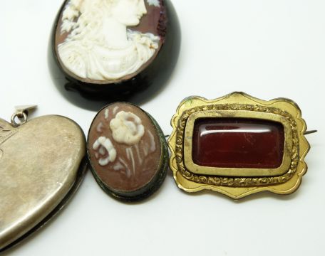 Victorian jet brooch set with a cameo, a silver heart locket, Victorian brooch, cameo brooch etc
