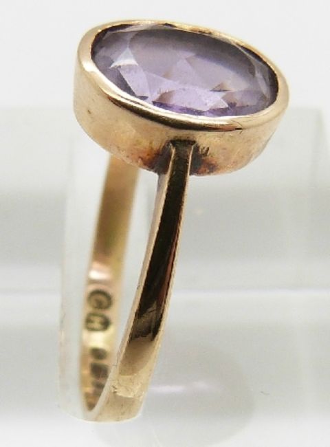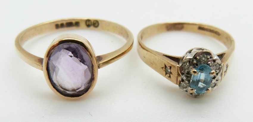 A 9ct gold ring set with an amethyst and a 9ct gold ring set with a topaz and diamonds, 3.7g