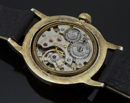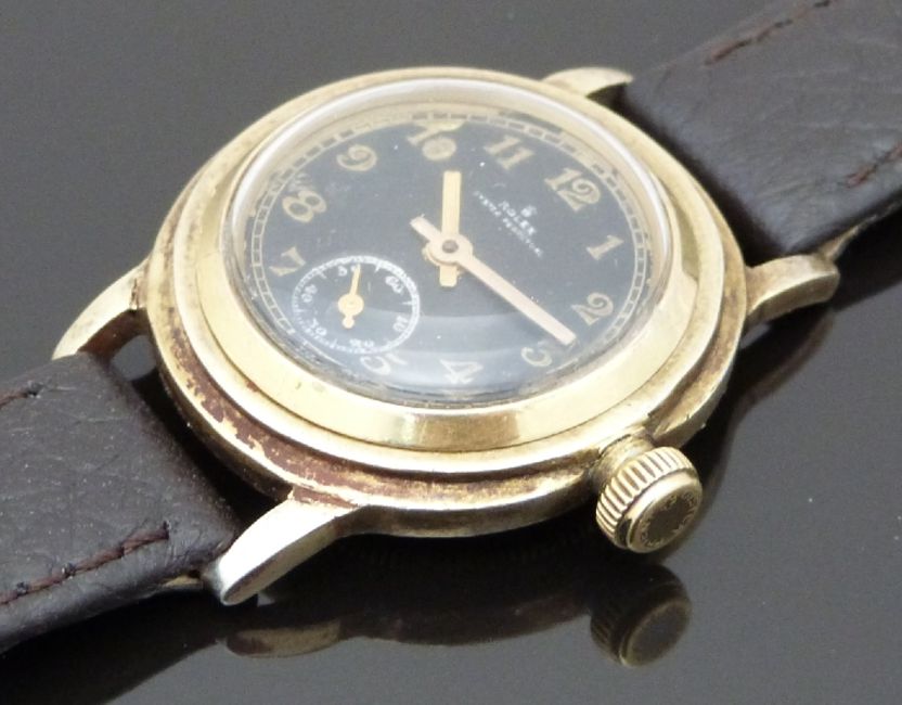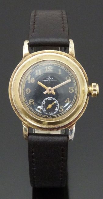 Rolex Oyster Perpetual 9ct gold gentleman's wristwatch ref. 2136 with inset subsidiary seconds dial, gold hands and Arabic numerals, black dial and signed 15 jewel movement, on black leather strap, case diameter 33mm, serial number 11414