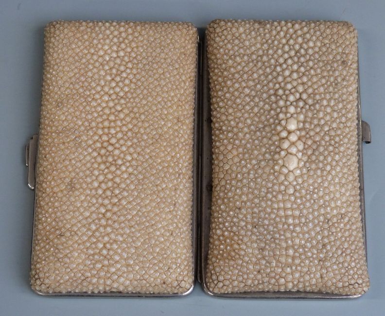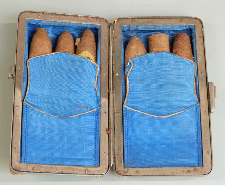 Shagreen covered cigar case with silk interior containing six cigars, some marked Coranto De Luxe, length of case 13.5cm