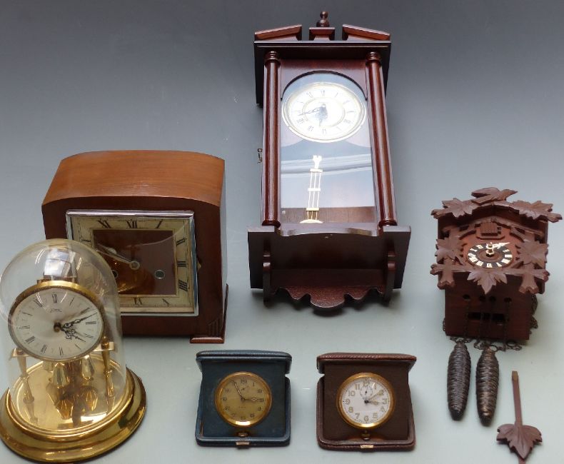 German Black Forest c1960 two train cuckoo clock, together with five other clocks to include 1930 mantel, c1920 8 day travel clocks, an Anniversary clock and a wall clock