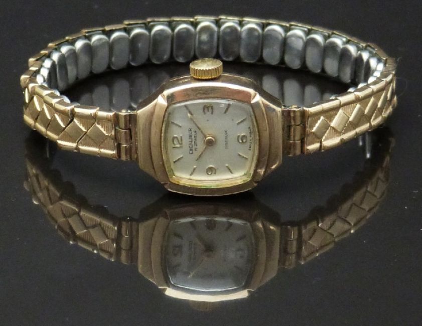 Excalibur 9ct gold ladies wristwatch with gold hands and hour markers, silver dial and 17 jewel movement, on expanding metal bracelet, case diameter 16.5mm, serial number 6344.