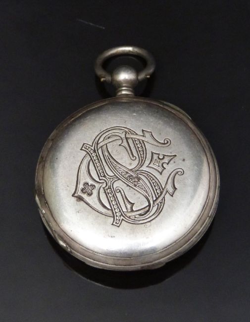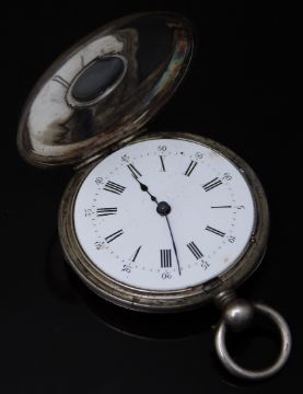 J A Aubert Freres white metal half hunter pocket watch with blued hands, black Roman numerals, white enamel dial, inlaid blue enamel Roman numerals to the case and signed dust cover, case diameter 38mm.