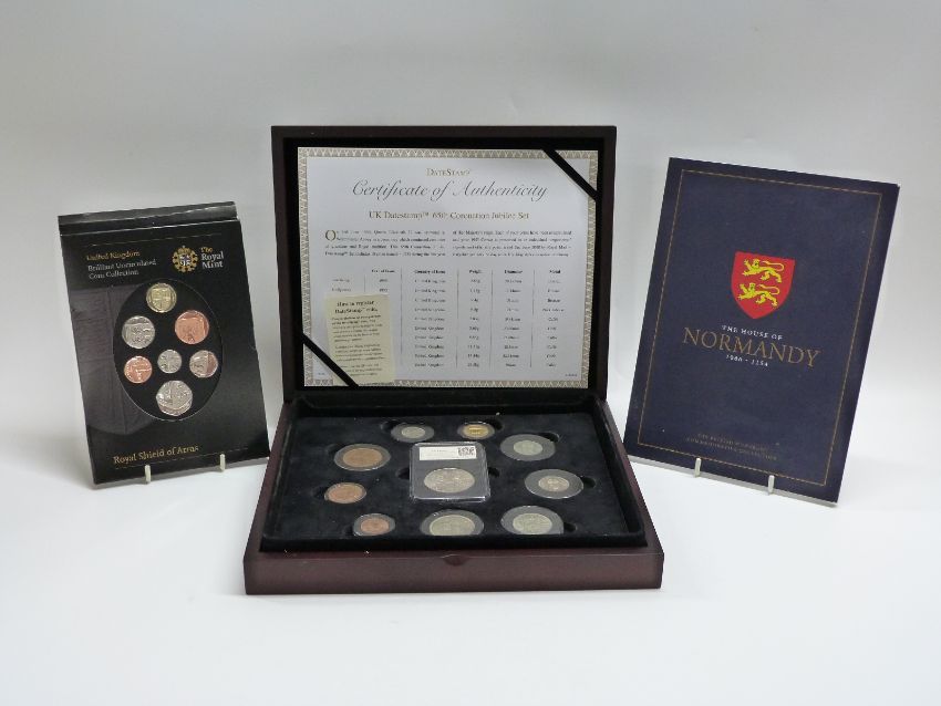 Date Stamp UK 65th Coronation Jubilee set of UK coins in deluxe case together with Royal Mint 2008 brilliant uncirculated set and a House of Normandy Westminster set