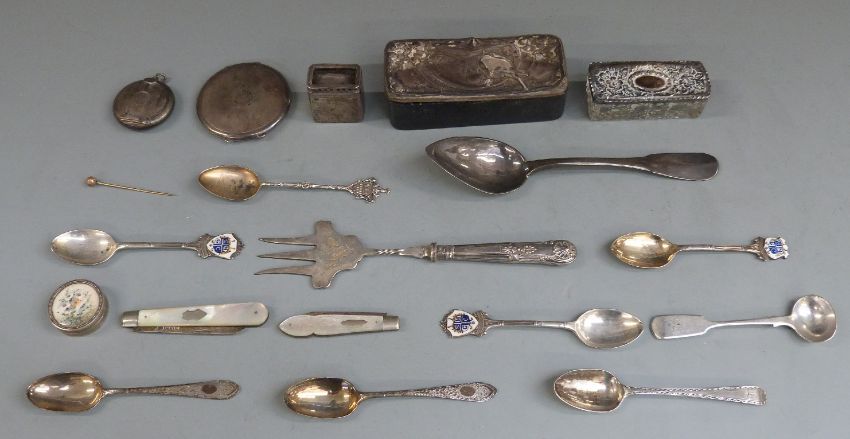 Hallmarked silver Art Deco style compact, similar smaller example, hallmarked silver and white metal spoons, French white metal spoon, weight 221g all in, Dutch white metal trinket pot, two hallmarked silver bladed mother of pearl knives, small trinket pot with note saying it was purchased from Christies in 1957 from the collection HRH Princess Royal etc.