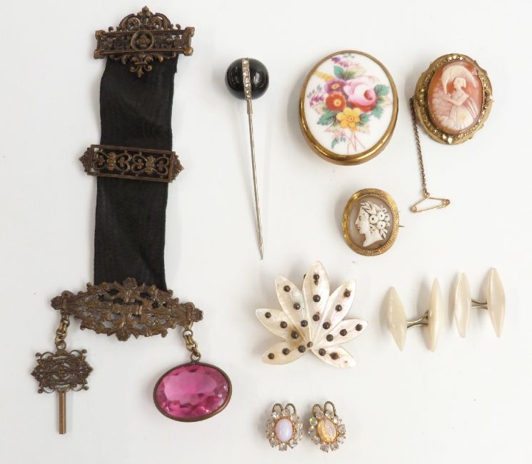 A collection of jewellery including two Victorian cameos, a mother of pearl brooch set with cut steel, mother of pearl cufflinks, Royal Worcester brooch, a chatélaine, etc