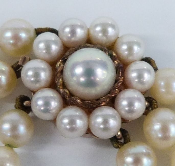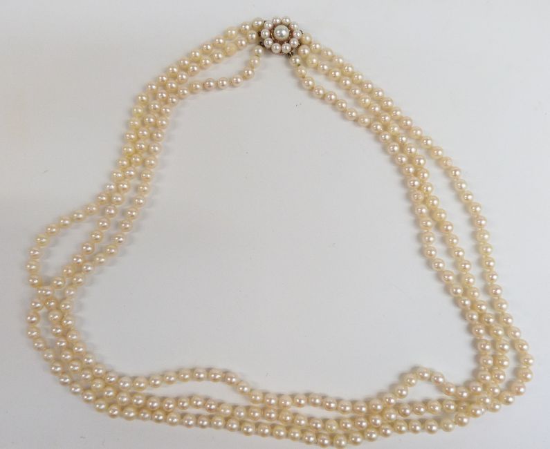 A three strand cultured pearl necklace with a 9ct gold clasp