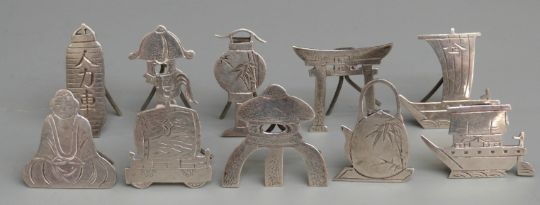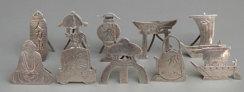 Set of ten Chinese or similar white metal menu or name holders, all formed as Eastern objects and marked Sterling with small easel backs, weight 35g