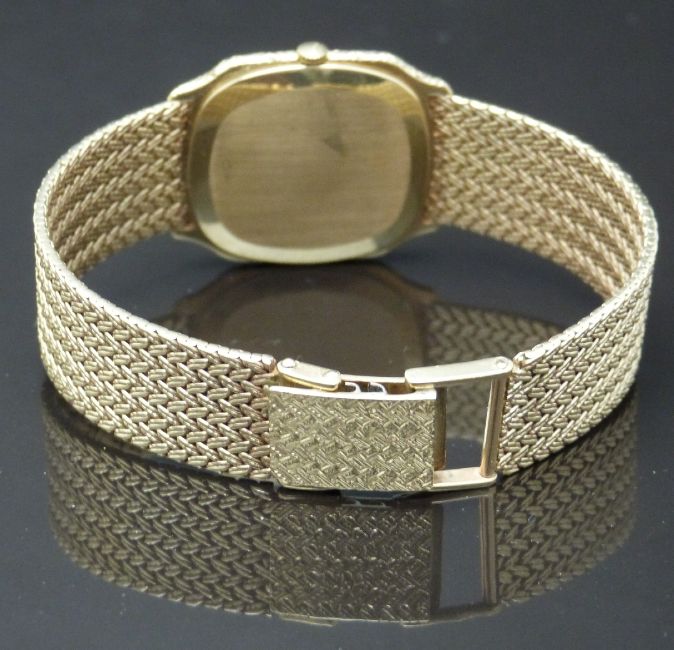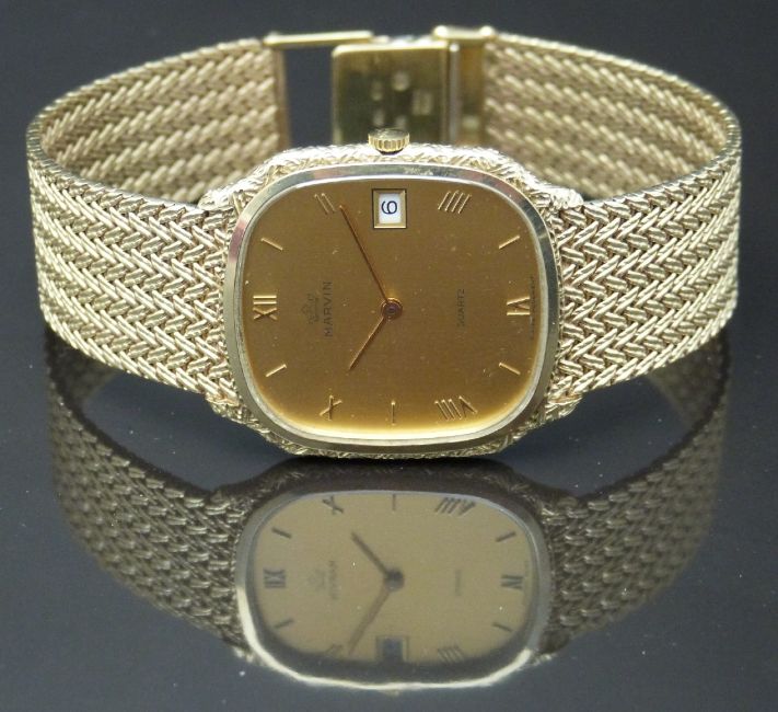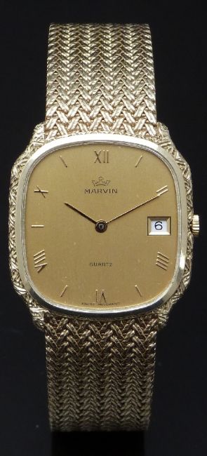 Marvin 9ct gold gentleman's wristwatch with date aperture, gold hands, Roman numerals and dial and quartz movement, on integral 9ct gold bracelet, case diameter 29.5mm, 48g, in original box with guarantee and service booklet.