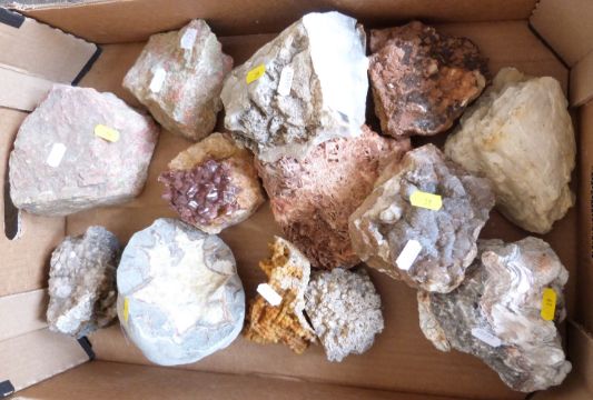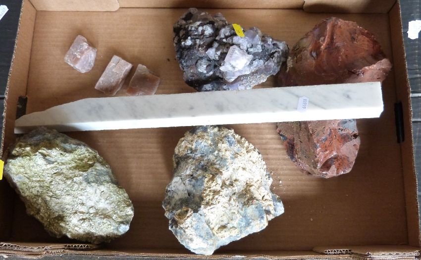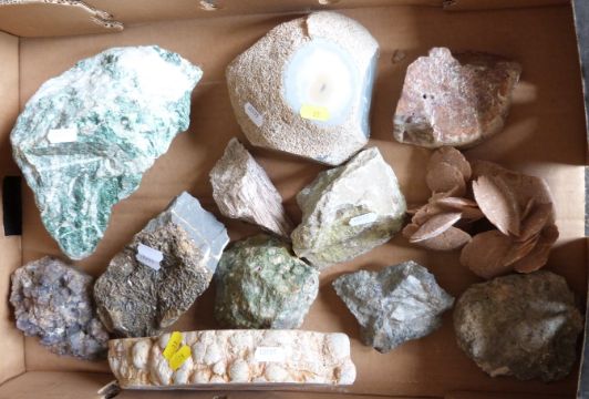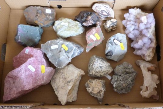 A large collection of mineral samples and geodes including gypsum, agate, quartz, sodalite, obsidian, lapis, tourmaline etc