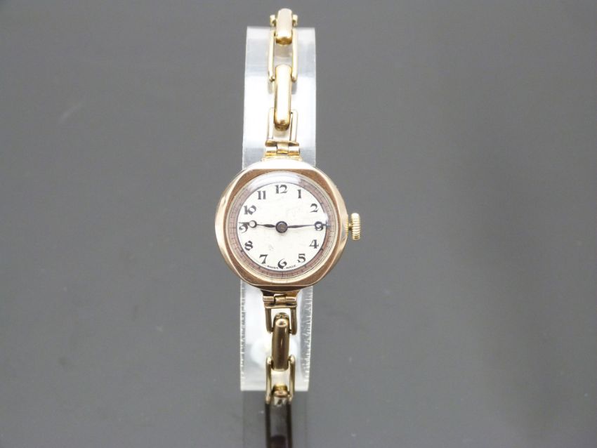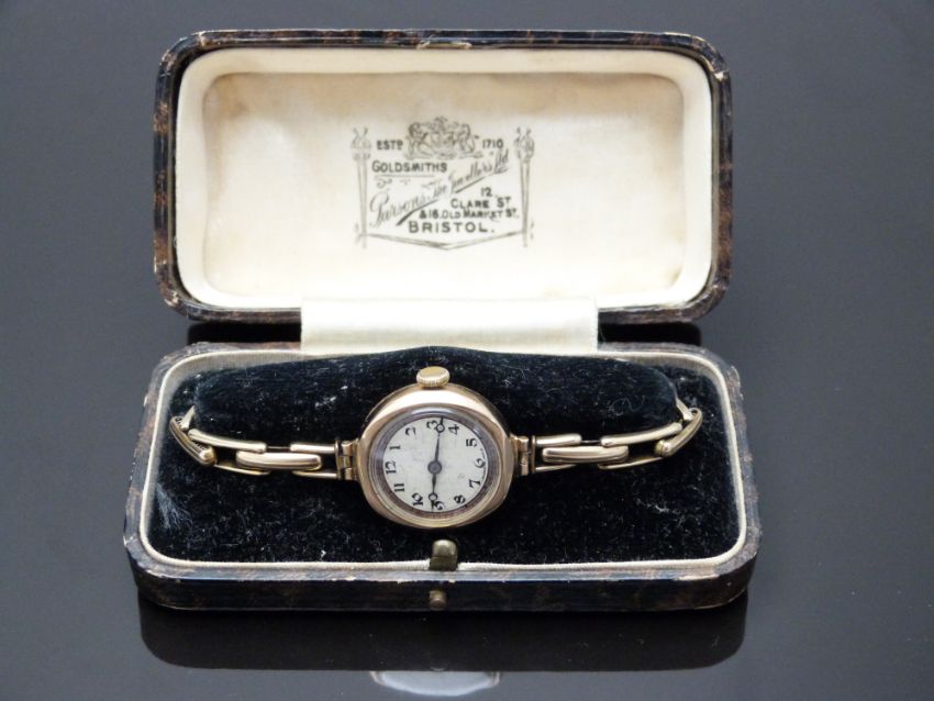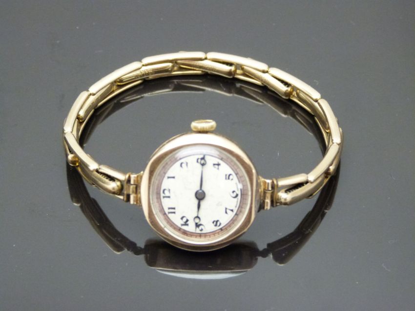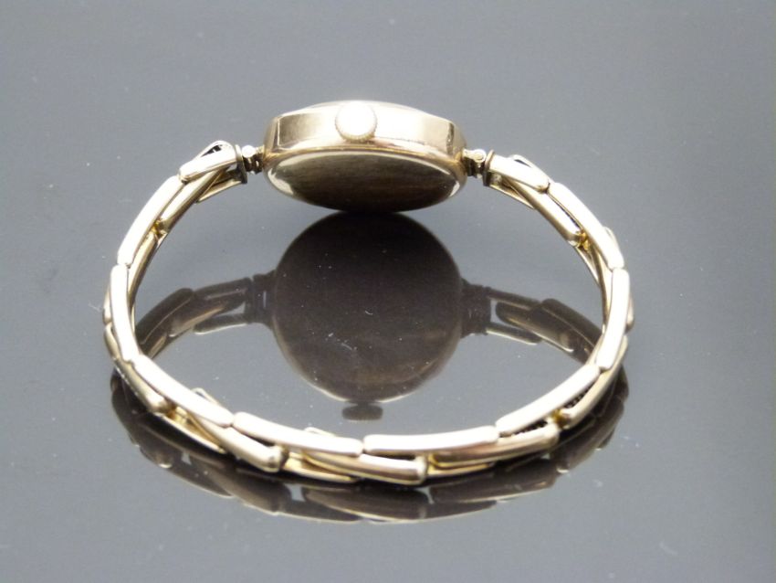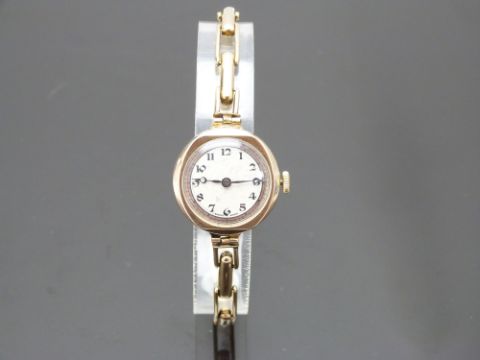 Rotary 9ct gold ladies wristwatch with blued Breguet hands, black Arabic numerals, two-tone silver dial and signed 15 jewel movement, on 9ct gold expanding bracelet, case diameter 23mm, serial number 213611, in Parsons Goldsmiths of Bristol box, 18g