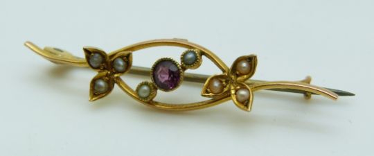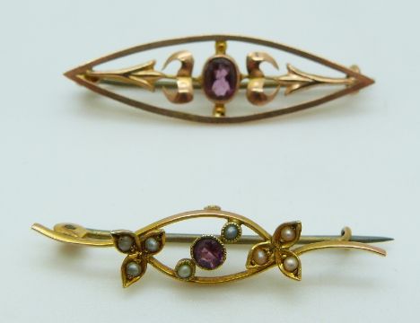 Two 9ct gold brooches, one set with an amethystthe other with seed pearls and an amethyst