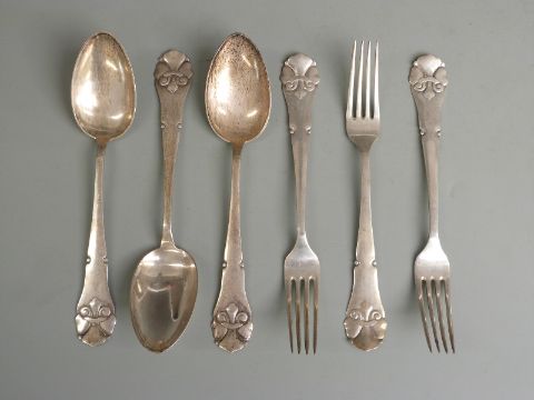Set of six Danish white metal spoons and forks with Danish silver marks for 1922 maker Christian F. Heise, length 21.5cm, weight 329g