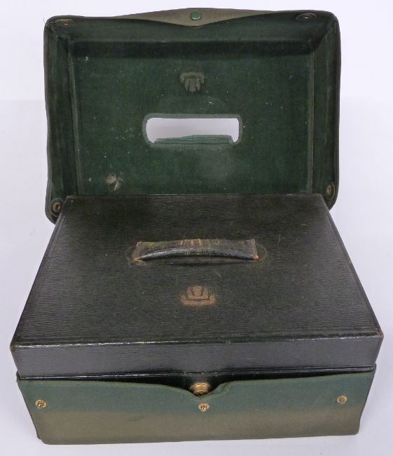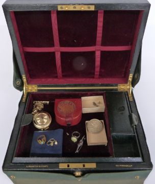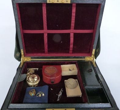 A leather jewellery box with Bramah lock by A Webster & Company, 60 Piccadilly, London with a small collection of jewellery including an 1887 silver crown, a filigree ring set with turquoise, etc