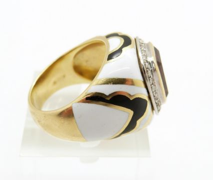 A yellow metal ring set with an emerald cut citrine surrounded by diamonds set with black and white enamel,17g, size M