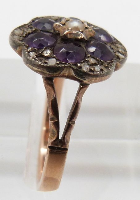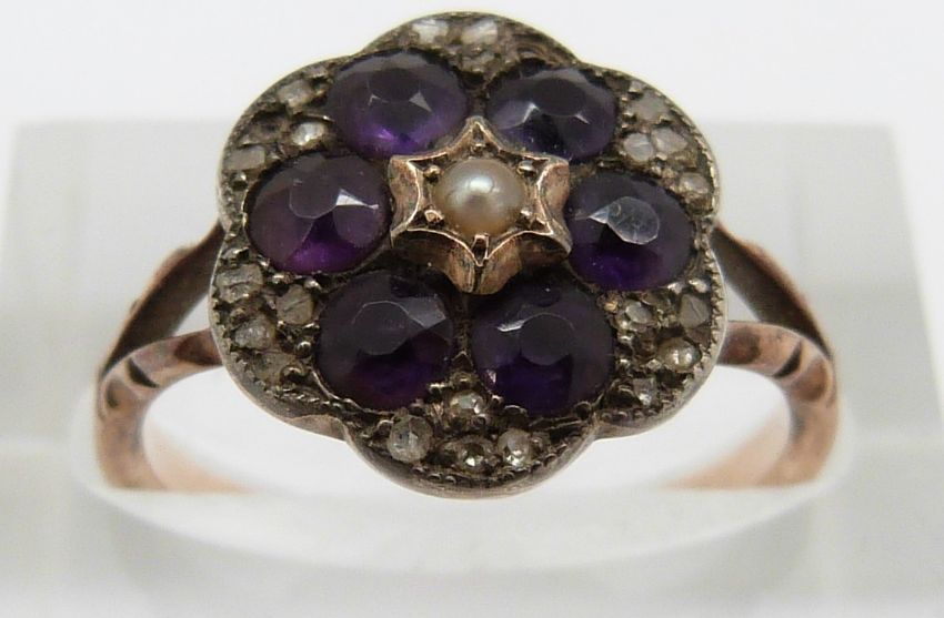 Victorian gold ring set with a central pearl, foiled amethyst and diamonds, 3g, size K
