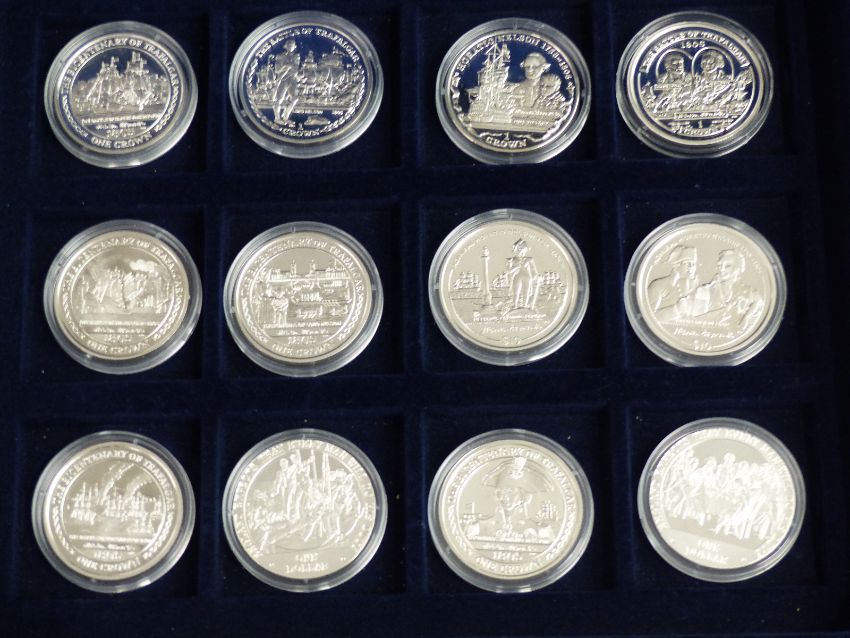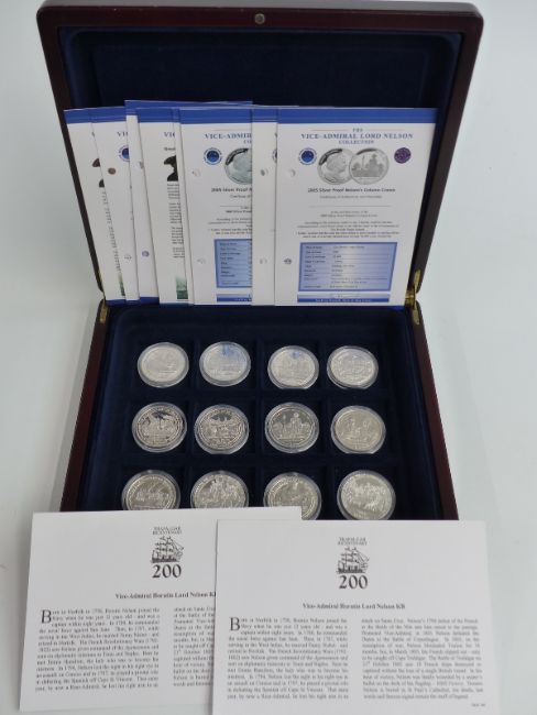 Silver proof Vice Admiral Lord Nelson collection comprising 12 commemorative silver crown sized coins, in deluxe case with certificates.