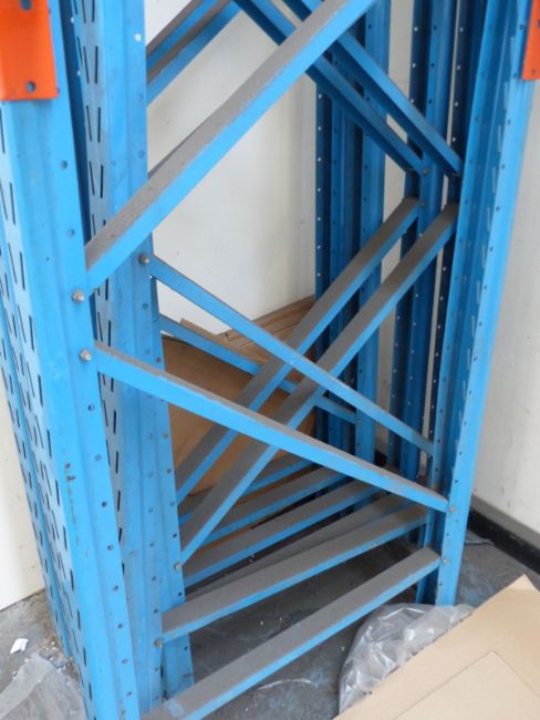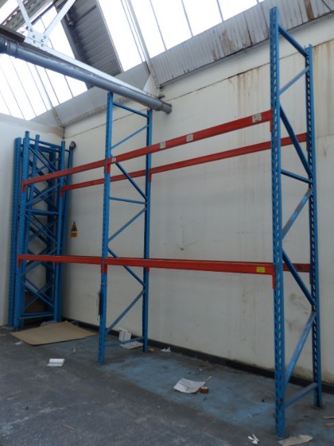 Two bays of heavy duty pallet racking comprising three 360x90cm uprights and eight 280cm cross beams together with five spare uprights.