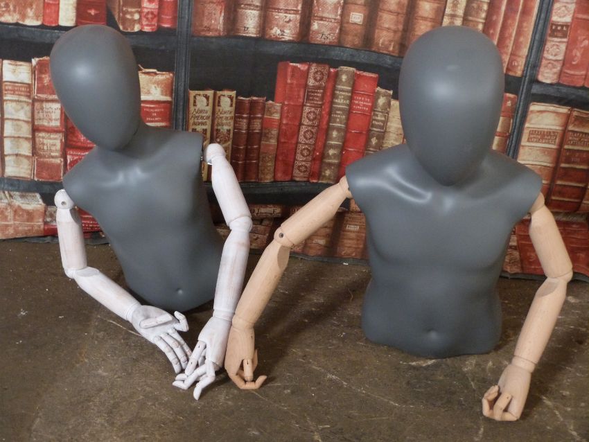 Haberdashery/shopfitting two half bust articulated mannequins, tallest 69cm