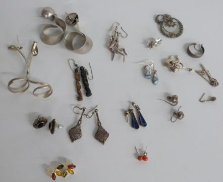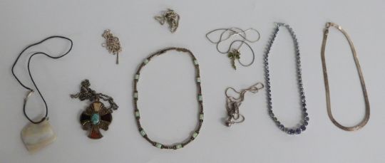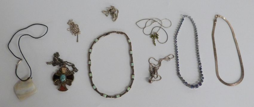 A collection of silver jewellery including rings set with agate, silver earrings, silver necklace set with marcasite and opals, Miracle necklace, Lea Stein brooch, etc
